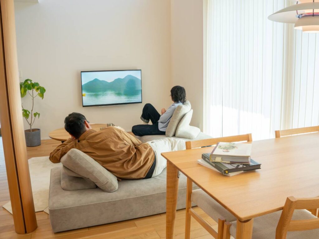 ソファでくつろぎながら、キッチンやダイニングにいる人の方を向いて話せて、リビングとダイニングを仕切る高い背もたれが無いから、家族のコミュニケーションがスムーズに。