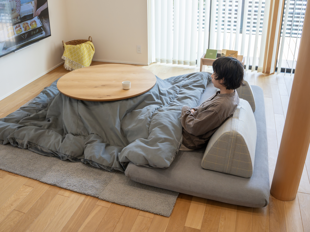 座面高20cm以下のソファに座ると、逆に足を前に伸ばしやすい。こたつの天板下にも足がスッと入り、ヒーターの熱で足がしっかり温まり、全身ぬくぬく。