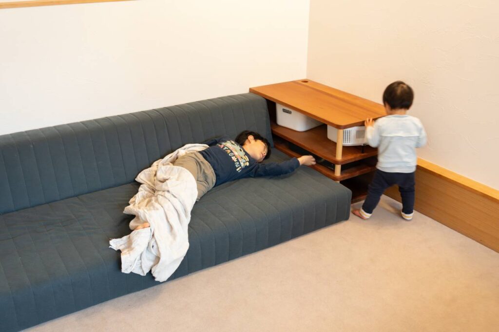 「ソファで寝落ちしたパパの上で、子供たちが遊んでることもあります。」