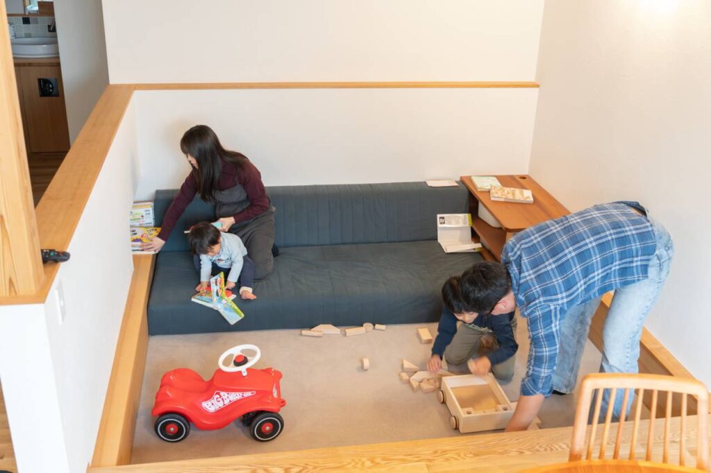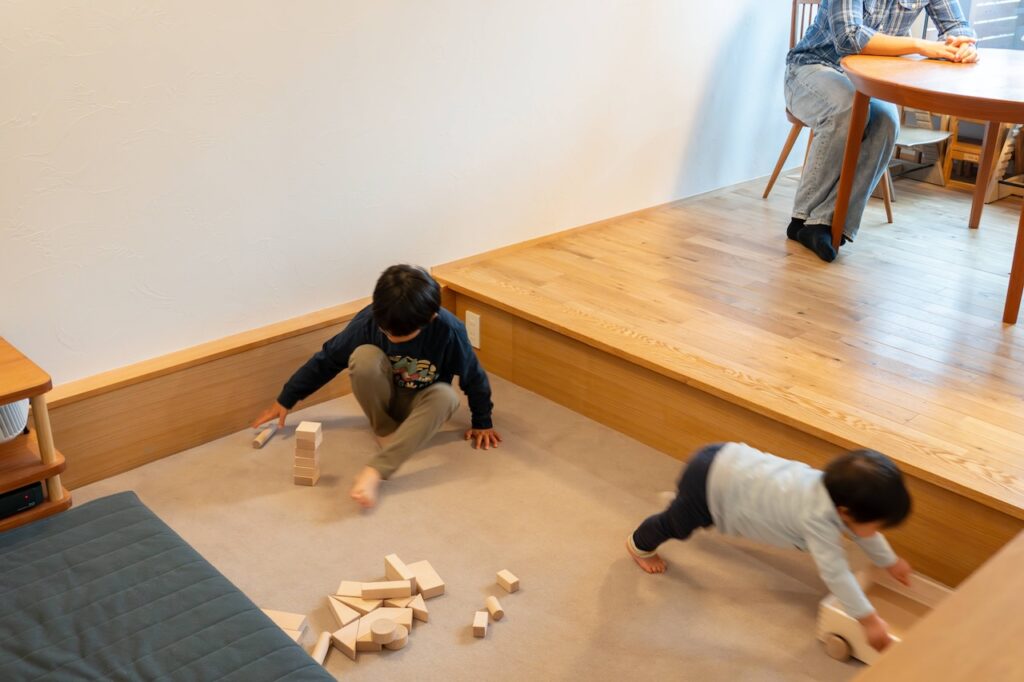 「子供たちにとっては、本当にここが居場所ですね。前の家では色々なところで過ごしてたけど、この家になってからはこのリビングダイニングだけ。普段はこのピットリビングにおもちゃがたくさん広がってます。」