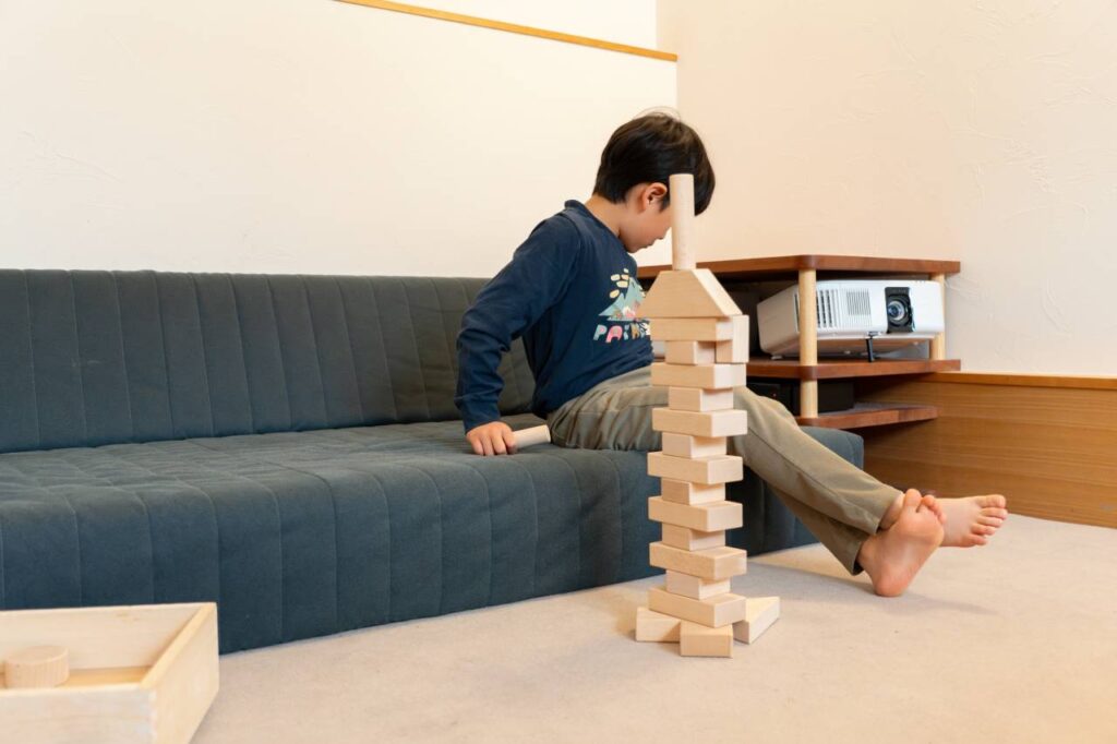 「こんなにアクロバティックに遊んでいても、つみきソファがワンクッションになってくれるので安心ですね。」
