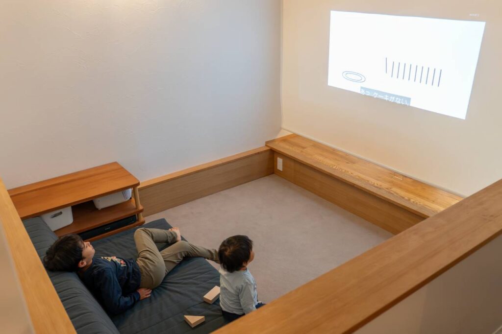 「テレビを置くと圧迫感が出るので、プロジェクターでロールスクリーンに映してます。エアコンも、エアコンカバーで覆ったり、目立たない位置に配置したり。
