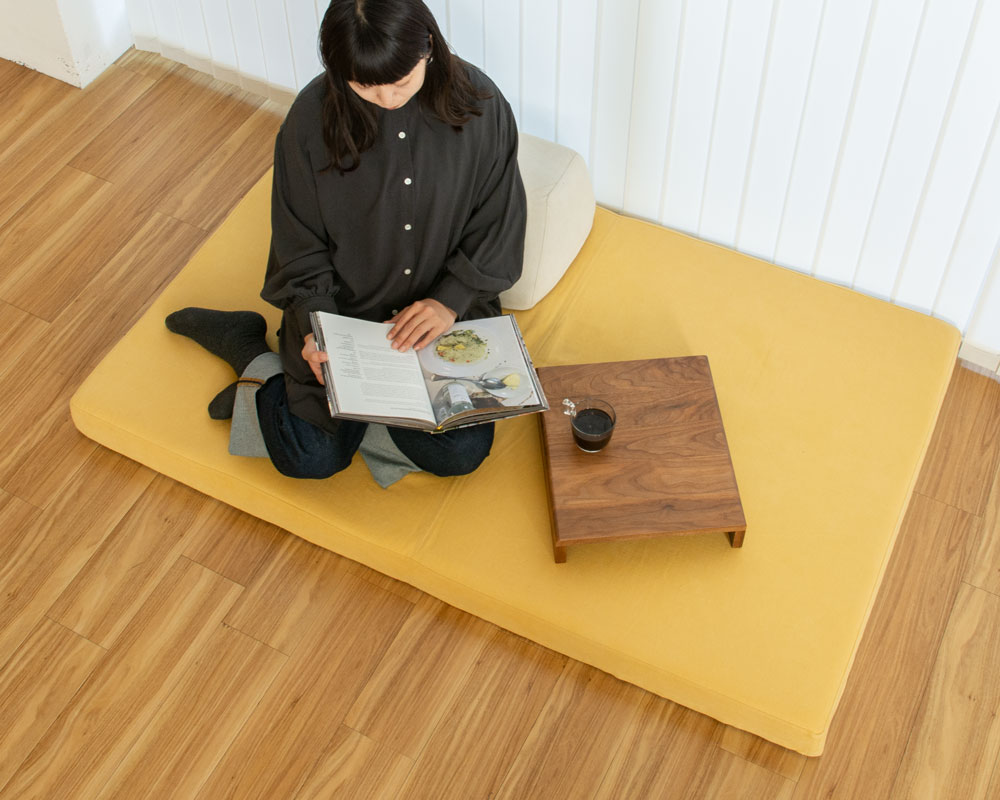 ソファの上でゴロゴロしたり、座ったり、あぐらをかいたりできるシンプル&フラットなローソファー。ホワイトのアイアンフレームがフラットなデザインをより一層引き立てます。