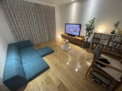 愛犬と座り比べて決めた、犬にも人にもちょうどいいソファ。 ソファ / つみきソファ 生地 / スタンダード : カプリス : ミッドナイト つみきソファ スタンダード ミッドナイト 3人掛けローソファ フロアソファ フロアがナチュラル系 ペットとソファ カプリス