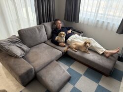愛犬と座り比べて決めた、犬にも人にもちょうどいいソファ。 ソファ / つみきソファ 生地 / スタンダード : カプリス : ミッドナイト つみきソファ スタンダード ミッドナイト 3人掛けローソファ フロアソファ フロアがナチュラル系 ペットとソファ カプリス