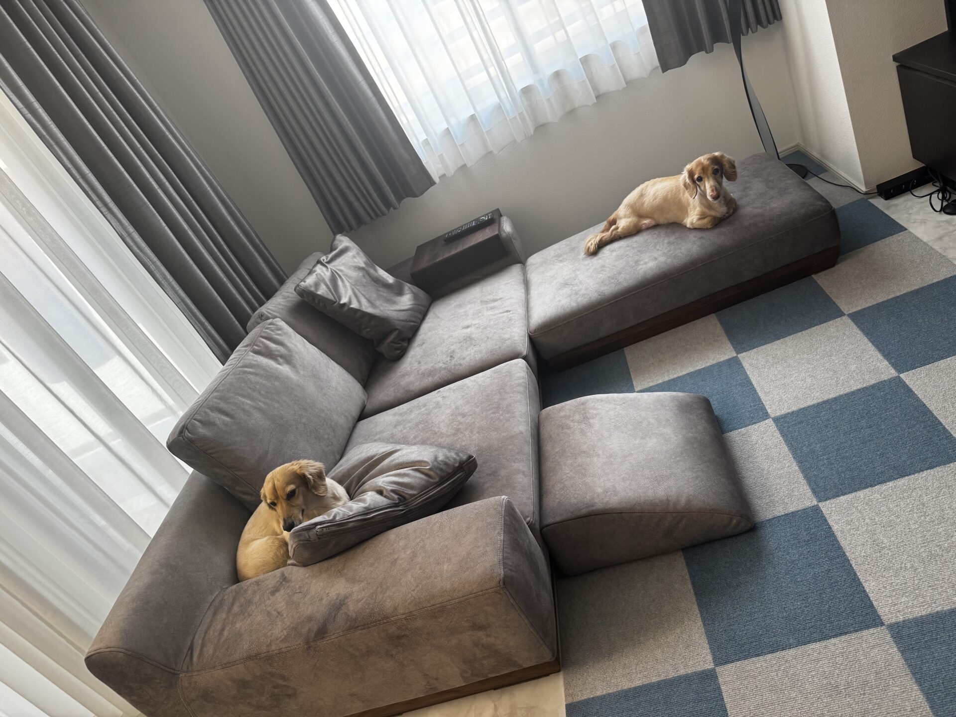 高級感の感じられる上品なグレーのアルバソファと、ブルー系のタイルカーペットのコーディネートが、とてもスタイリッシュでわんちゃんたちも映える素敵なお部屋ですね。