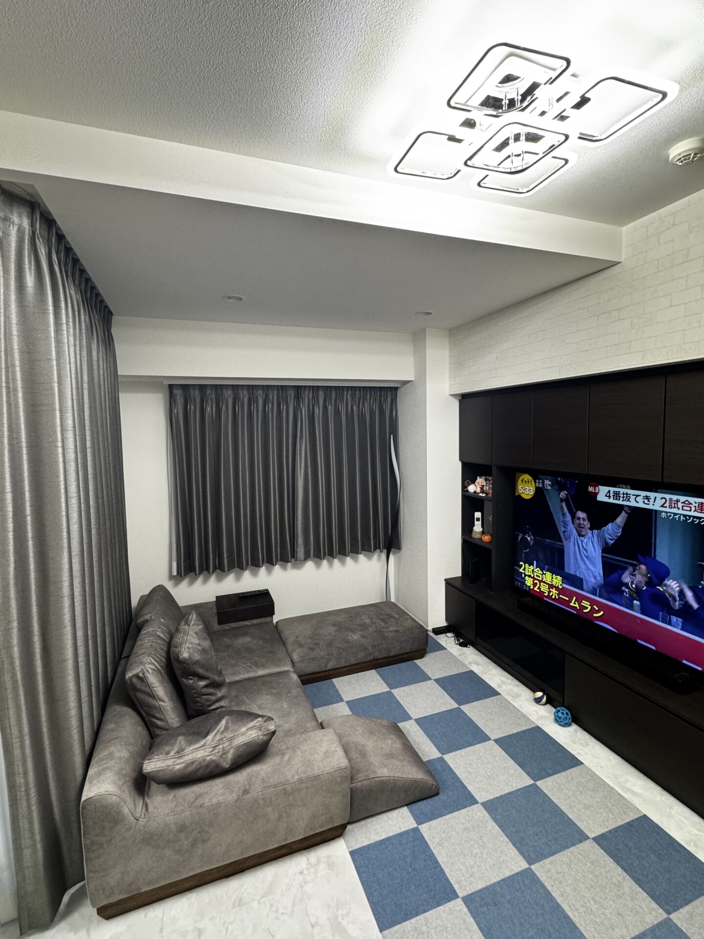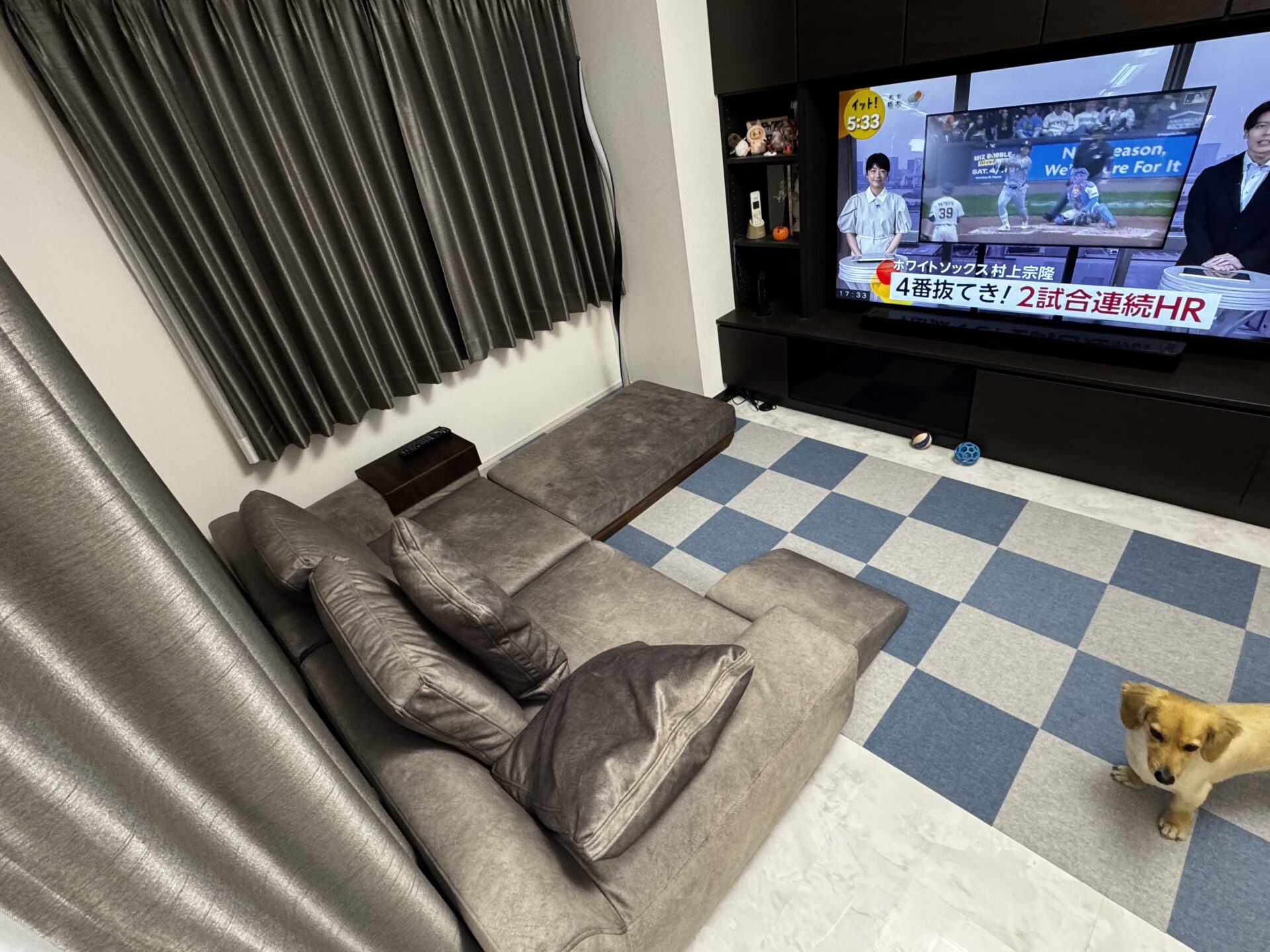 また、ローソファーという事もあり、部屋が広く感じ、またテレビとの視線もちょうど良くこんな嬉しい副産物効果もあるのかと笑